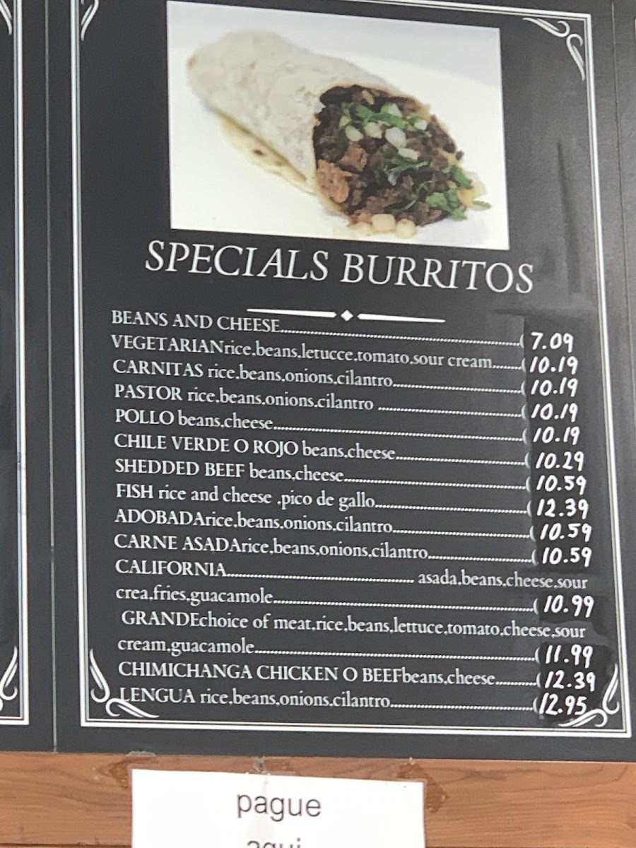 Choice of meat (Carne asada, carnitas, shredded chicken or pastor), rice, beans, lettuce, cheese, sour cream and guacamole.
