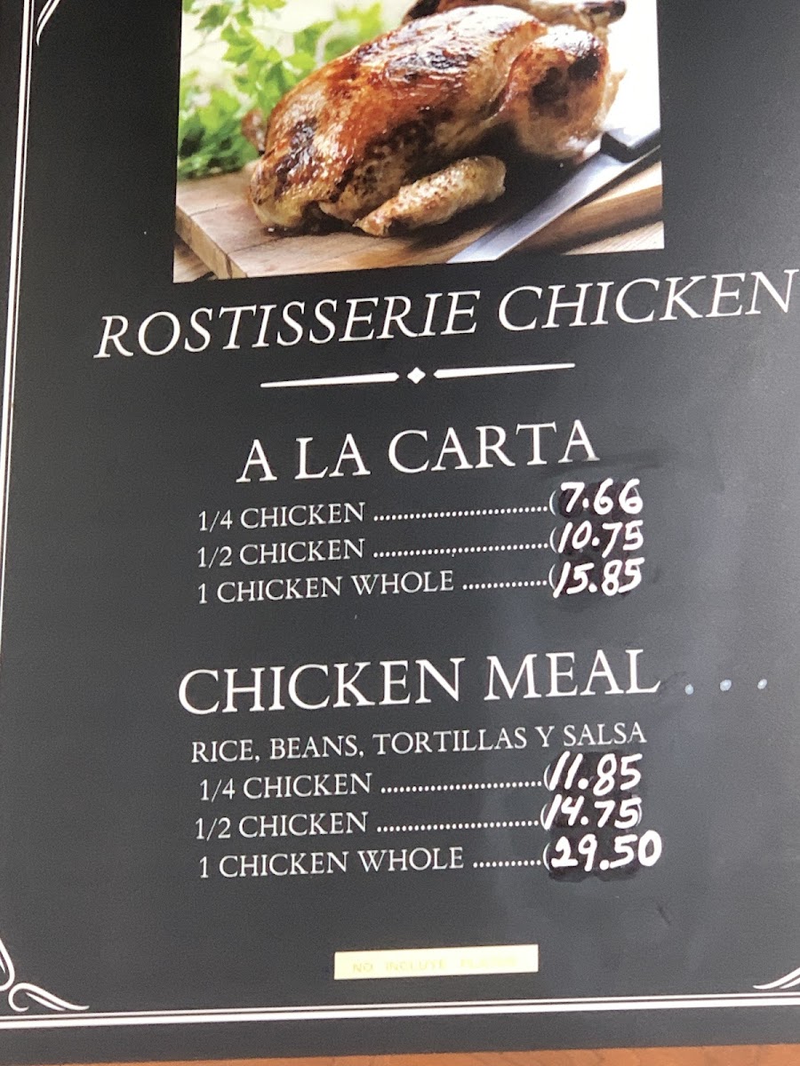 1 piece of rotisserie chicken and 1 enchilada with red or green sauce and a choice of chicken, shredded beef carnitas or cheese. Served with rice and beans.